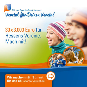 Die Sparda-Bank Hessen unterstützt 30 Vereinsprojekte mit je 3.000 Euro. Es gibt insgesamt sechs Themenkategorien, in denen sich Vereine anmelden können. Jede Kategorie hat ihr eigenes Online-Voting und die jeweils fünf beliebtesten Projekte gewinnen je 3.000 Euro.